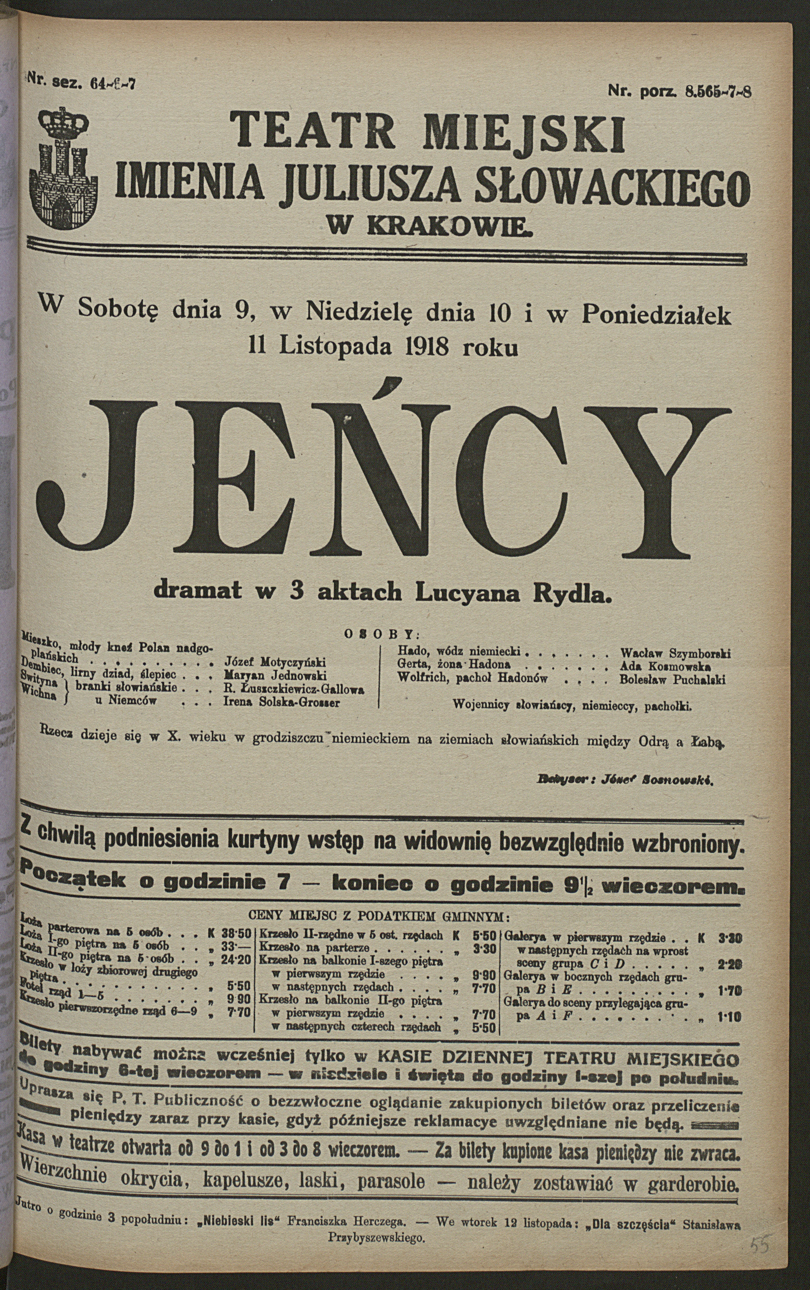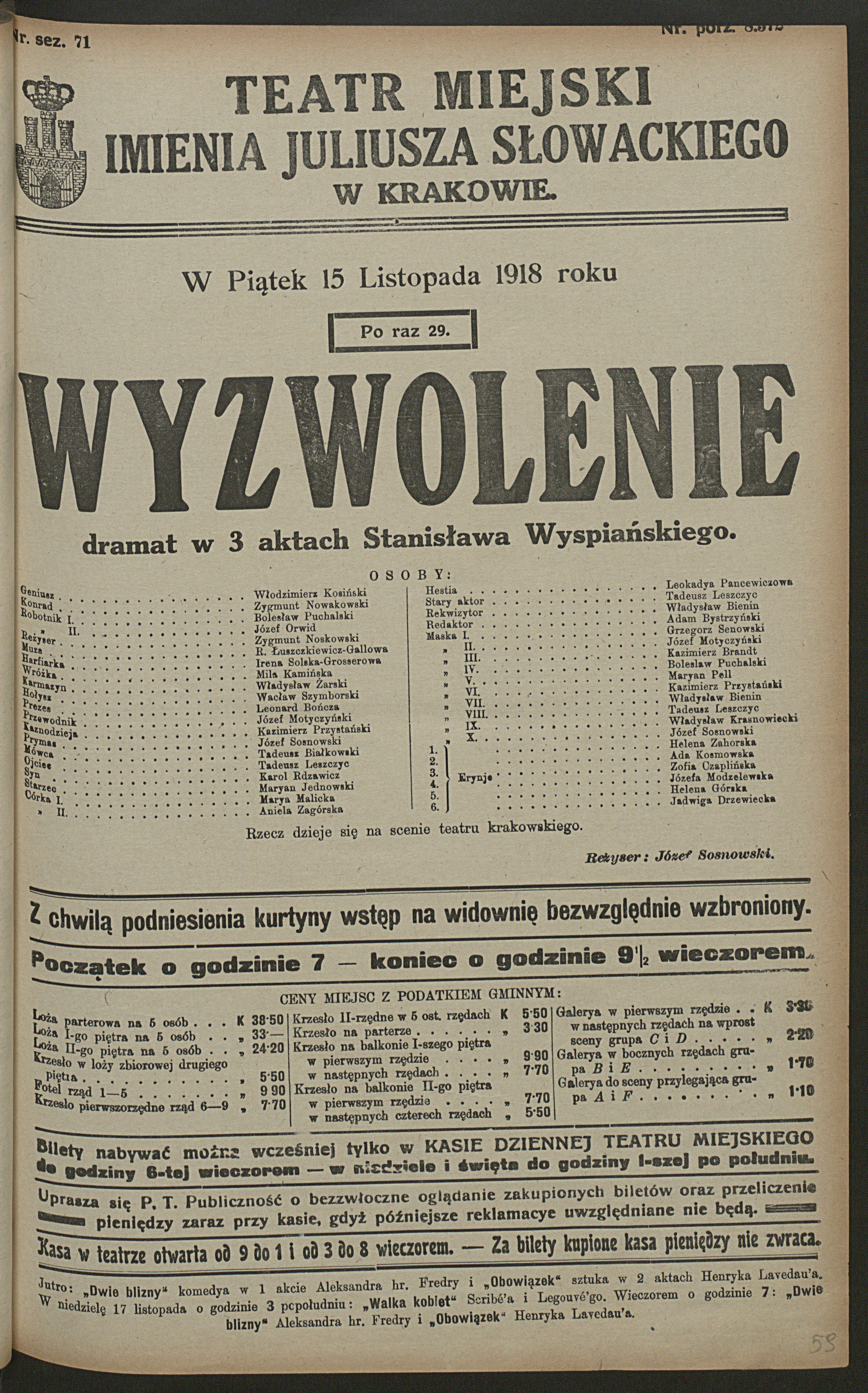 10.11.2025Jutro obchodzimy Święto Niepodległości. A jak wyglądał krakowski teatralny listopad 1918 roku, w cieniu wydarzeń takich jak odbicie odwachu czy rozbrajanie Austriaków na ulicach? Data 11 listopada miała nabrać historycznego znaczenia dopiero po jakimś czasie. W rzeczywistości odzyskiwanie niepodległości było procesem, czasem wzmożenia, euforii i nadziei. Tamtej jesieni, 11 listopada, na naszej scenie grano Jeńców Lucjana Rydla – dramat o dążeniu do polskiego miejsca na Ziemi: „akcja dzieje się w X wieku w grodziszczu niemieckim na ziemiach słowiańskich między Odrą i Łabą” – widnieje na afiszu. Teatralna kulminacja nastąpiła kilka dni później, gdy 15 listopada zagrano, (wystawione też 20 października z okazji 25-lecia Teatru), wznowienie Wyzwolenia Stanisława Wyspiańskiego. Spektakl reżyserował Józef Sosnowski, a bohaterem wieczoru był Zygmunt Nowakowski w rolach Reżysera i Konrada, przyszły dyrektor Teatru Słowackiego, którego aktorstwo i niedawna przeszłość legionowa splotły się w poruszającą całość. Geniusza grał Włodzimierz Kosiński, również niedawny Legionista. Obaj, podobnie jak wielu innych aktorów naszego Teatru, właśnie wracali do swojego prawdziwego – choć scenicznego – wyzwolonego świata. Następnego dnia, 16 listopada, Teatr odwiedził entuzjastycznie witany Józef Piłsudski…