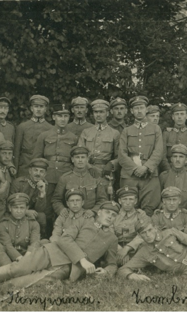 Opis zdjęcia znajdującego się po lewej stronie - Zygmunt Nowakowski (z kartką ręce) wśród żołnierzy ze swojego oddziału Legionów.